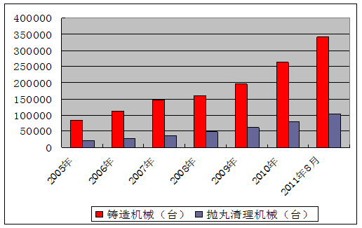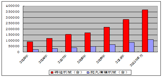 2005年我國拋丸機(jī)產(chǎn)量為22789臺(tái)套,截至2011年8月末,我國拋丸機(jī)產(chǎn)量已達(dá)110000臺(tái)套,年均增長26%。