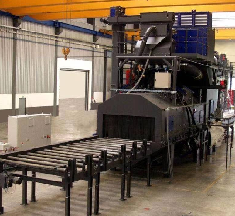 穿梭車托盤拋丸機(jī)主要是由清理室、室內(nèi)輸送輥道與進(jìn)出輸送輥道、拋丸器、彈丸循環(huán)系統(tǒng) ( 含提升機(jī)、分離器、縱橫螺旋輸送器和供丸管道 ) 、吹掃機(jī)構(gòu)、除塵、電氣控制等功能部件組成) 。