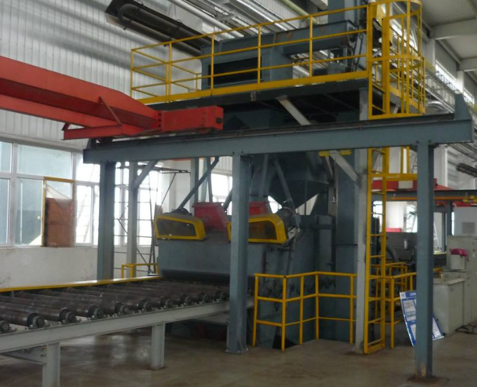 鋼托盤拋丸機主要是由清理室、室內(nèi)輸送輥道與進出輸送輥道、拋丸器、彈丸循環(huán)系統(tǒng) ( 含提升機、分離器、縱橫螺旋輸送器和供丸管道 ) 、吹掃機構(gòu)、除塵、電氣控制等功能部件組成) 。
